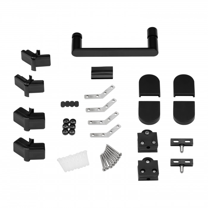 Верхний профиль, нижний профиль, боковые профили, расширительные профили, петли, держатели стекла, комплект крепежей, заглушки, ручка, набор уплотнителей, глухие стекла, стеклянная дверь.
