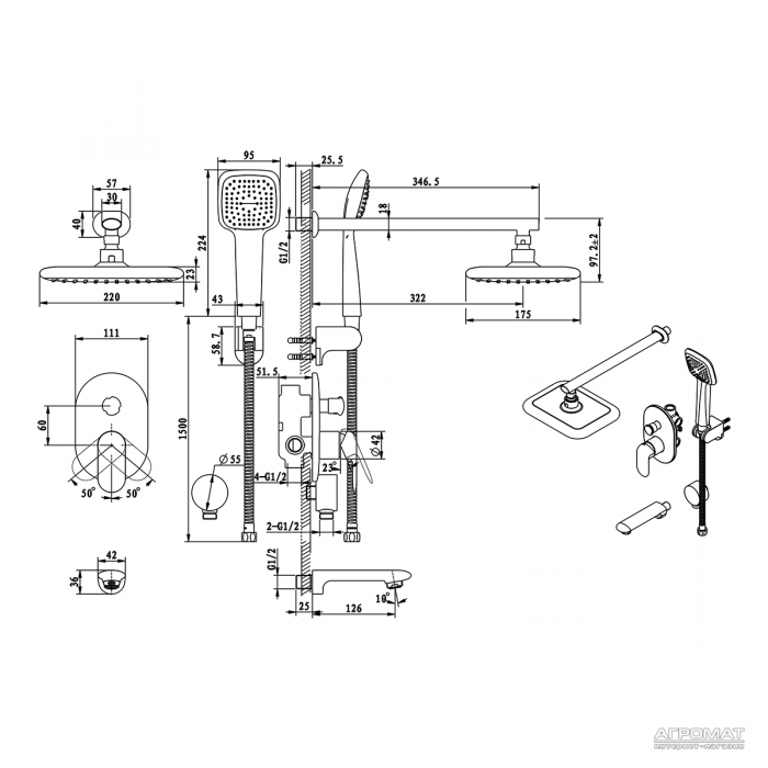 ручний душ, верхній душ, тримач, вилив на ванну, змішувач для раковини, підключення для душового шлангу, душовий шланг