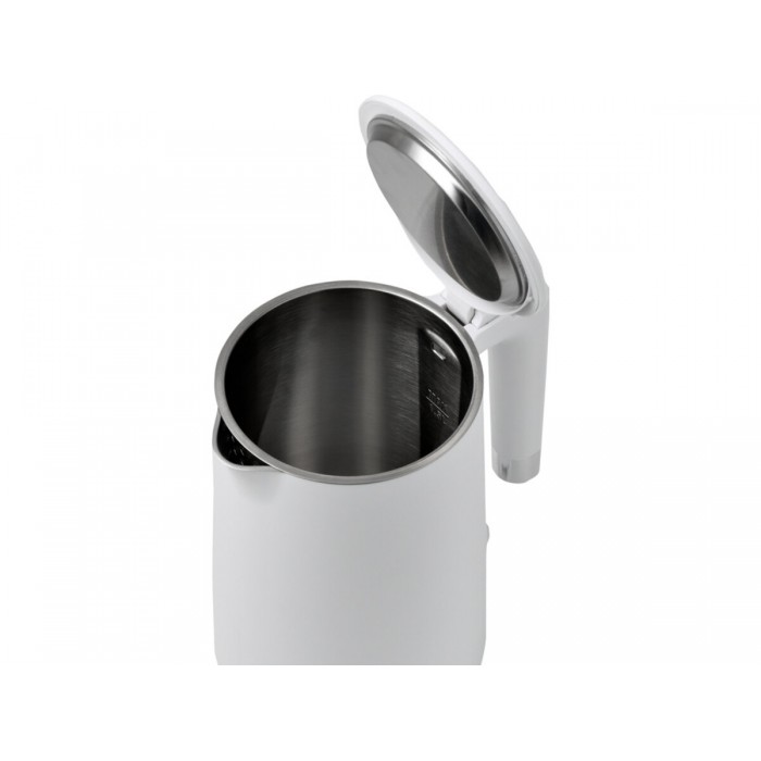 об'єм: 1,5 л потужність: від 1850 до 2200 Вт Основа, що обертається на 360° прихований нагрівальний елемент з нержавіючої сталі Колір: білий кабель можна втягнути матеріал: нержавіюча сталь 304 і поліпропілен Електричний чайник ємністю 1,5 л. Завдяки своїй мінімалістичній формі та однотонному кольорі чайник ідеально впишеться в сучасний інтер’єр. Корпус чайника складається з подвійних стінок. Внутрішня стінка і кришка виготовлені з нержавіючої сталі, а зовнішня частина покрита кольоровим поліпропіленовим корпусом. Додаткові функції безпеки, такі як автоматичне відключення та захист від перегріву, підвищують безпеку. Великий отвір полегшує наливання води та очищення, а знімний сітчастий фільтр зберігає воду чистою.