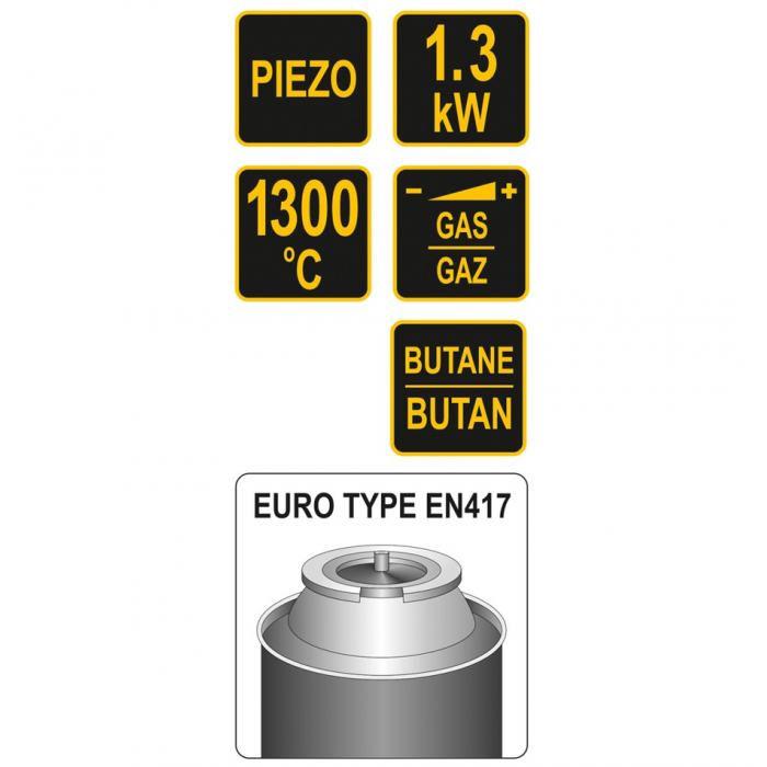 Газовий пальник з п'єзо запалюванням. Живиться від газу бутану із зовнішнього балона - відповідно до стандарту EN417. Підключення циліндра до пальника типу TWIST. Пальник потужністю 1,3 кВт досягає температури 1300 ° C. Витрата газу 96 г / год. Пальник має регулювання потужності полум'я.
