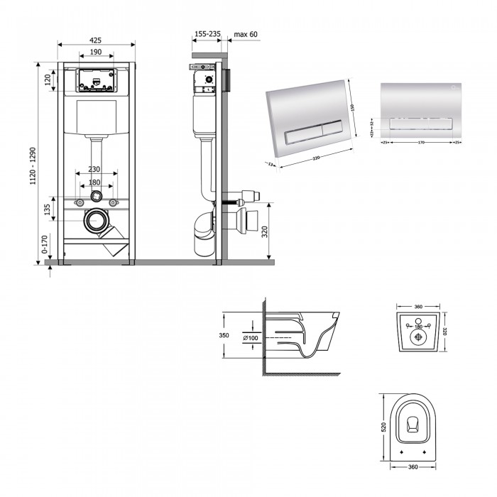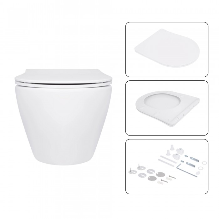 Инсталляция, панель смыва, звукоизоляционная прокладка, унитаз, сиденье, крепежи.