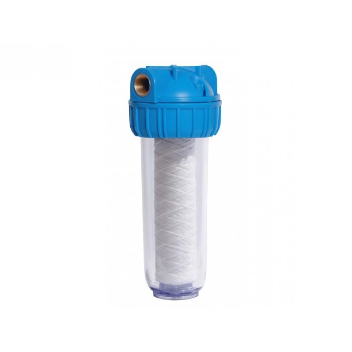 Фильтр с прозрачным корпусом состоящий из двух частей, с латунной резьбой и уплотнительным кольцом. На головке находиться воздушный клапан для удаления воздуха после замены картриджа. Прозрачный корпус позволяет наблюдать за процессом фильтрации и визуально оценивать степень загрязнения фильтра.