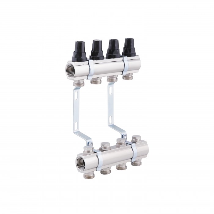Коллектор SD Forte 1" на 4 выхода позволит регулировать распределение тепла в петлях системы радиаторного отопления, теплого пола. Верхняя балка оборудована термоклапанами с ручками настройки черного цвета, нижняя — вентилями ручной регулировки. На термостатические клапаны можно установить сервоприводы 30х1,5 для автоматического управления температурным режимом в отапливаемых помещениях. Поставляется вместе с кронштейнами для крепления в шкафу или к стене.