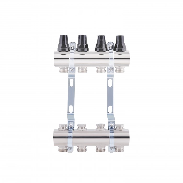 Коллектор SD Forte 1" на 4 выхода позволит регулировать распределение тепла в петлях системы радиаторного отопления, теплого пола. Верхняя балка оборудована термоклапанами с ручками настройки черного цвета, нижняя — вент...
