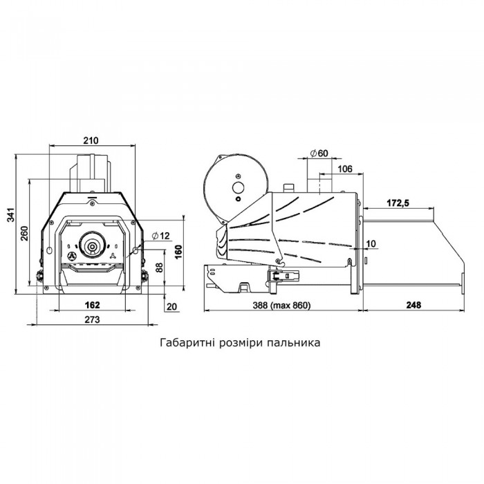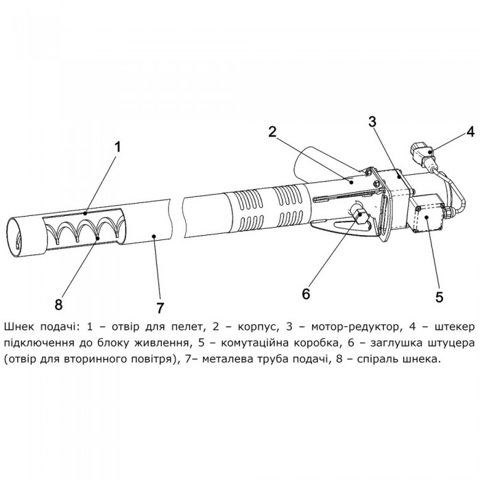 Пеллетная горелка, подающий шнек, гофрированный трубопровод, воздушный шланг, контроллер управления горелкой Ecomax Plum 860 с элементами электронной коммутации, паспорт, инструкция, гарантийный талон