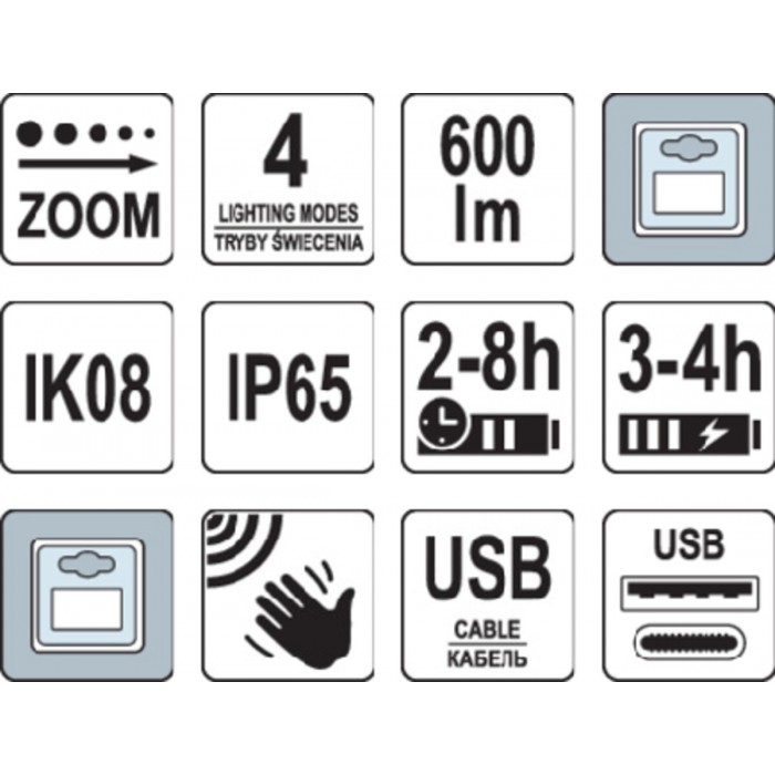 Ліхтар на чоло діодний YATO YT-085941 Джерело енергії: Li-Po акумуляторна батарея 1200 мАг, 3,7 В постійного струму. час праці: 8 год (30%), 4 год (50%), 2 год (100%) час зарядки: 3-4 h індикатор стану зарядження акумуляторної батареї життєздатність: 100000 г Зарядний пристрій USB Type C Джерело світла: Світлодіоди потужністю 5 Вт 4 режими освітлення: 100%, 50%, 30%, імпульсний кількість люменів: 600 лм (100%), 300 лм (50%), 100 лм (30%) робочий діапазон: 34,9 м (висока), 60,6 м (середня), 87,5 м (низька) Конструкція та особливості: датчик руху, що активується рухом руки функція масштабування вимикач водонепроникний: IP65 механічну міцність: IK08 колір світла: 6000-7000 K CRI: >70 еластичний ремінець стійкий до подряпин, ударів, вм'ятин та хімічних речовин матеріал ABS вага: 160 g розміри: 64,5 x 43,3 x 52 мм IP65 - захист від пилу та водяних бризок, що потрапляють на корпус з будь-якого боку (12,5 л/хв). IK08 - ударна в'язкість 2 Дж. CRI - індекс кольоропередачі в діапазоні від 0 до 100 - чим вищий параметр, тим краща кольоропередача і природніший вигляд. ABS - характеризується дуже високою стійкістю до подряпин, ударів і вм'ятин, а також до різних хімічних речовин Акумуляторна фара з вбудованим датчиком руху, що дозволяє вмикати та вимикати світло помахом руки. Він ідеально підходить для активного відпочинку, занять спортом і роботи вночі або в темряві. Чотири режими роботи дозволяють адаптувати освітлення до вашої діяльності та рівня заряду батареї. Активація датчика рухом руки також стане в нагоді, коли ви працюєте брудними руками, в рукавичках або не маєте можливості активувати вимикач. Чотири режими роботи дозволяють адаптувати освітлення до вашої діяльності та рівня заряду батареї, забезпечуючи тривалість освітлення до 8 годин. ЛІхтар випромінює світловий потік 600 лм і має дальність дії до 87,5 м