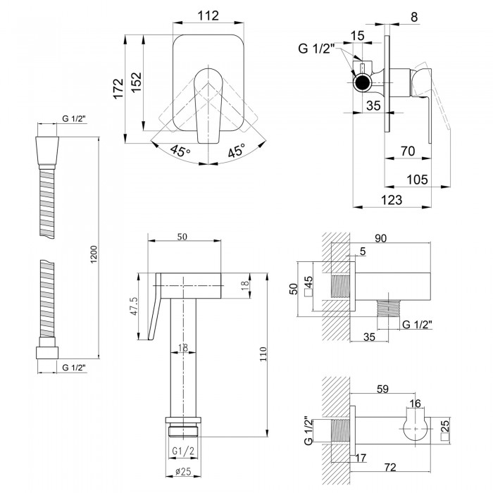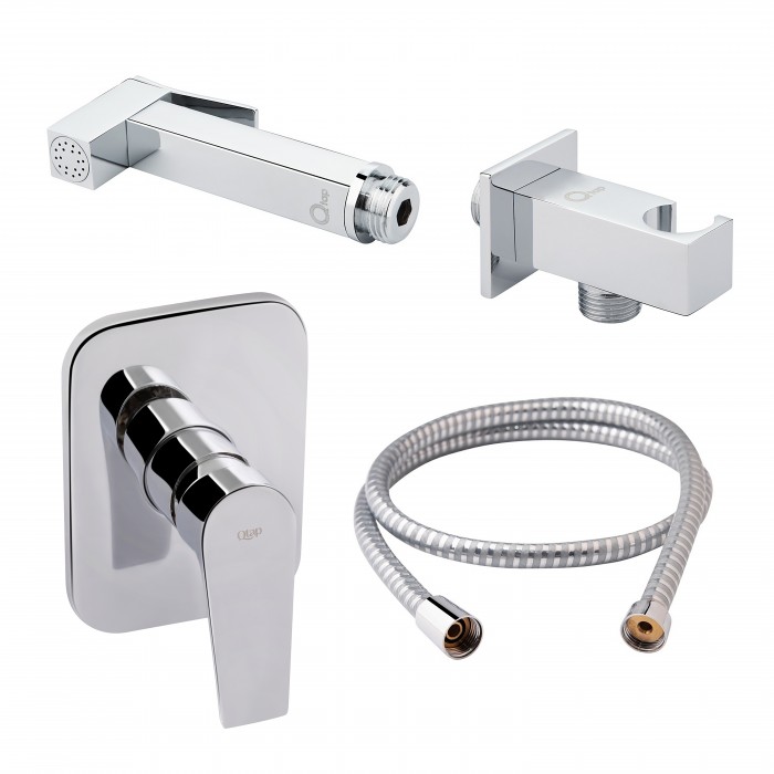 Лейка для гигиенического душа, смеситель скрытого монтажа, шланговое подсоединение со встроенным держателем лейки, душевой шланг, крепежи.