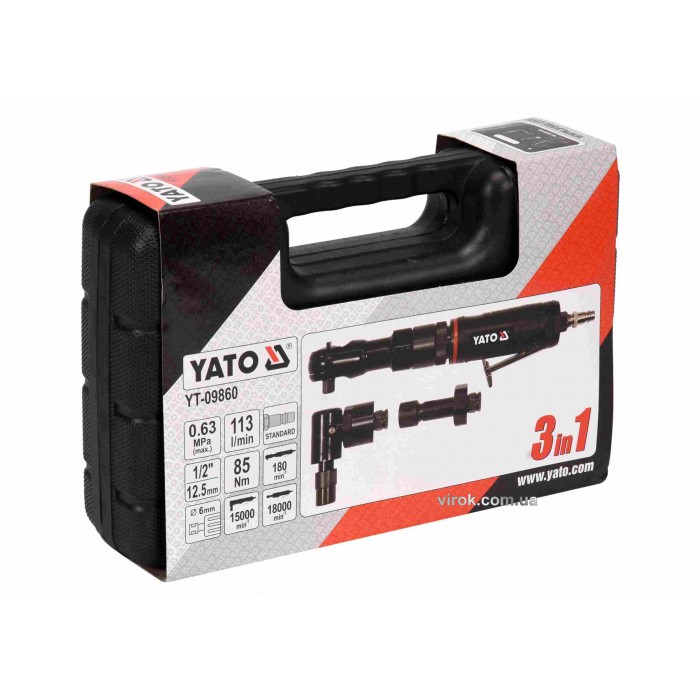 Универсальный пневматический инструмент 3 в 1 YATO YT-09860 Универсальный пневматический инструмент 3 в 1 YATO YT-09860 со сменными наконечниками, сочетает в себе функции трещотки 1/2", прямой и угловой шлифовальной маши...