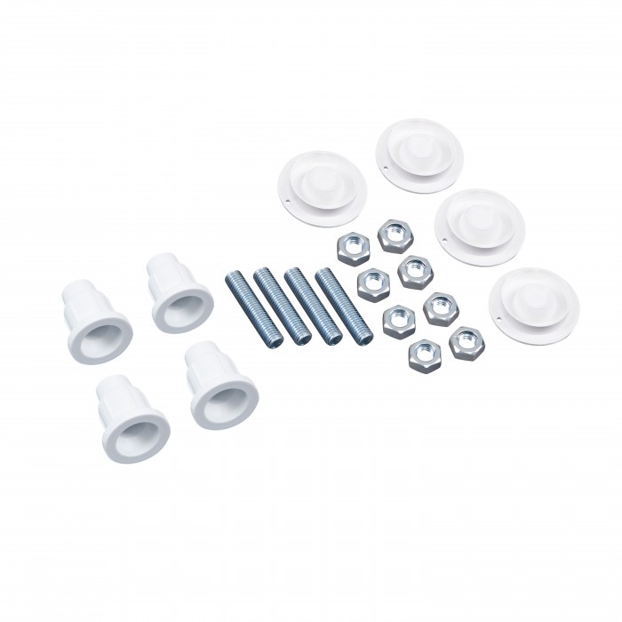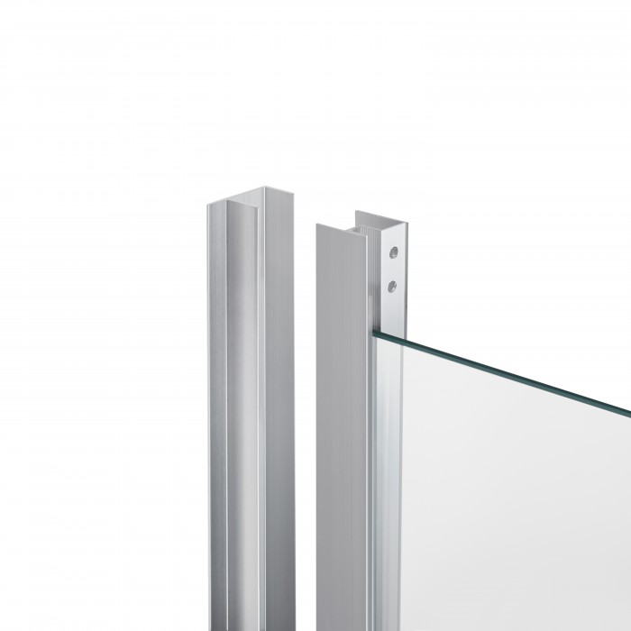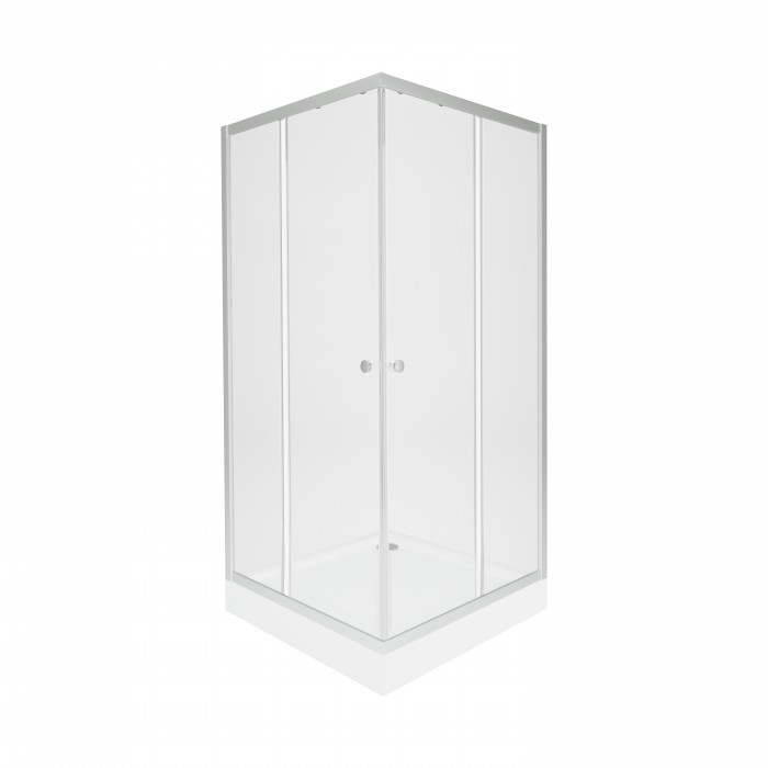 Поддон, двойные ролики, ручки, верхний профиль, нижний профиль, боковые профили, набор уплотнителей, расширительные профили, 2 стеклянные двери, 2 глухих стекла, комплект крепежей, заглушки, соединяющие элементы, фиксаторы, ножки, сифон с гидрозатвором.