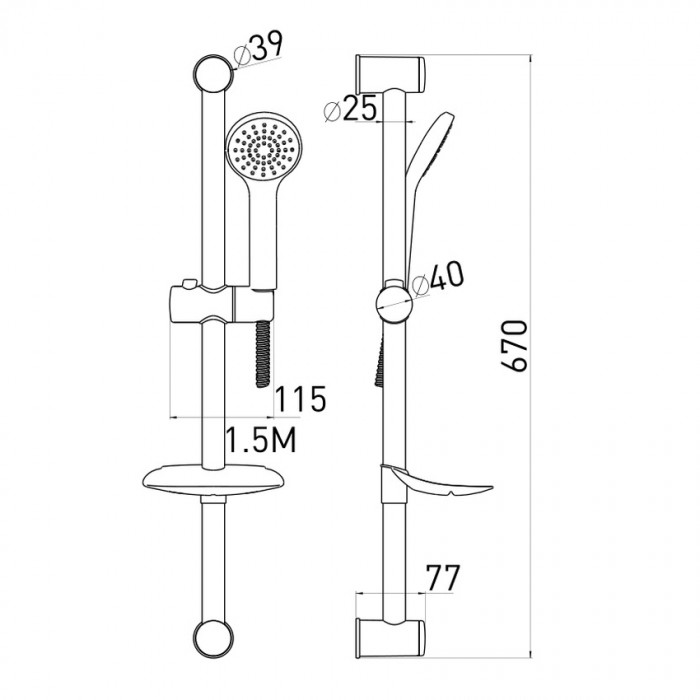 Штанга душевая VOLLE NEMO L-67 см, мыльница, ручной душ 1 режим, шланг 1,5 м, (15146100)