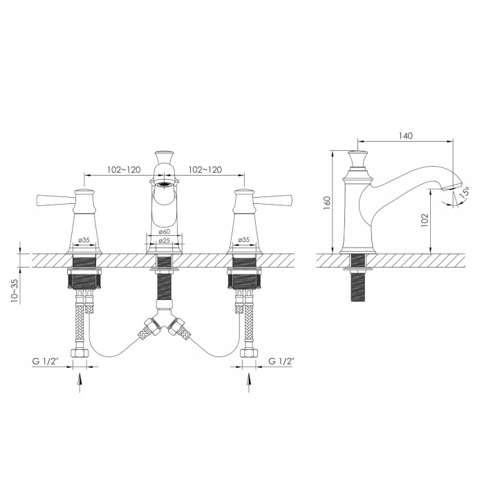 PODZIMU LEDOVE смеситель для раковины, настольный монтаж, двухвентильный, латунь, цвет хром. Модель установленных кран-букс Lifetime F118 1/2" LTC и Lifetime F118 1/2" RTC