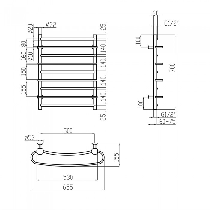 Полотенцесушитель водяной Lidz Standard (CRM) РЛС D32/20х1/2" 500x700 P5