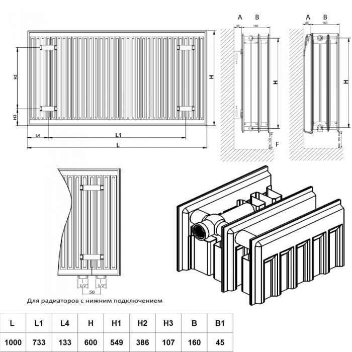 Радиатор стальной Daylux 33 тип 600х1000 боковое подключение