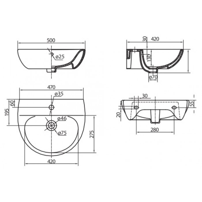 Универсальная установка, округлая форма, 1 отверстие под смеситель в центре...