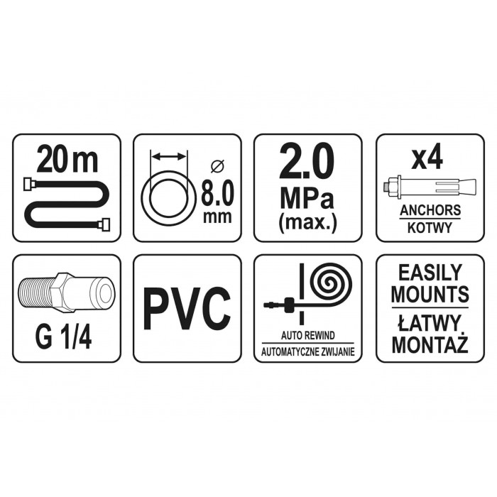 Шланг пневматический YATO на катушке с автосматыванием 8 мм 20 м
