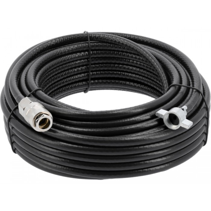 Професійний гнучкий шланг для стисненого повітря. Адаптований до автомобілів з повітряним компресором. Використовується для перекачування та продування в автобусах, вантажівках, напівпричепах, сільськогосподарських тракторах тощо. Кабель завершується роз’ємами з обох сторін. З одного боку він закінчується наконечником-метеликом з внутрішньою різьбою M16x1,5 мм, адаптованим до автомобільних компресорів. З іншого боку, універсальний металевий швидкісний з’єднувач, що дозволяє підключати різні пневматичні пристрої та інструменти, наприклад, пістолети для продування. Шланг складається з трьох шарів. Внутрішня частина виготовлена з м'якого ПВХ і щільного, текстильного армуючого поліефірного обплетення. Зовнішній шар з атмосферостійкого ПВХ. зовнішній діаметр: 10 мм внутрішній діаметр: 6 мм робочий тиск: 1,0 МПа (10 атм) при температурі навколишнього середовища 23 ° С тиск розриву: 3,5 МПа (35 атм) при температурі навколишнього середовища 23 °C безпечний діапазон робочих температур: від -20 °C до 60 °C вага: 0,5 кг