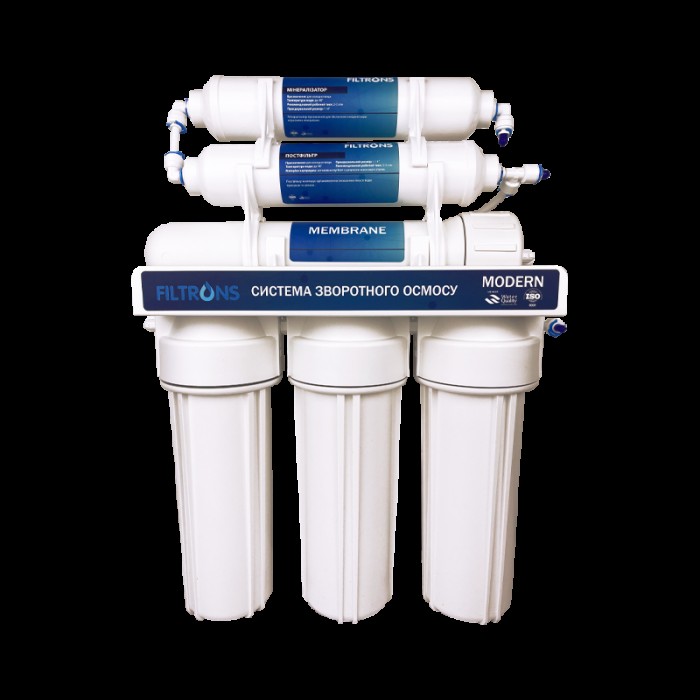 6-ти ступенева система зворотного осмосу Modern – це високоефективний спосіб очищення води, який використовується для видалення різноманітних забруднень, включаючи віруси та бактерії. Система складається з шести етапів фільтрації, кожен з яких спрямований на видалення певного типу забруднень, що забезпечує комплексне очищення води.