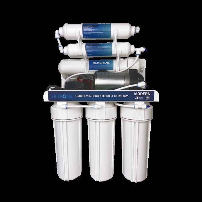 6-ти ступенева система зворотного осмосу Modern – це високоефективний спосіб очищення води, який використовується для видалення різноманітних забруднень, включаючи віруси та бактерії. Система складається з шести етапів фільтрації, кожен з яких спрямований на видалення певного типу забруднень, що забезпечує комплексне очищення води.