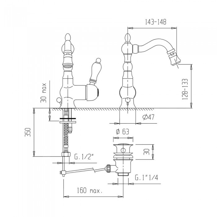 Смеситель, гибкая подводка, донный клапан, крепежи.