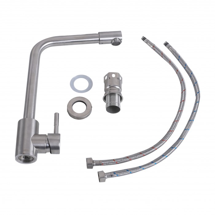 Тип смесителя: смеситель кухонныйТип выброса : поворотныйМатериал: нержавеющая сталь SUS 304Высота смесителя, мм: 340Картридж: 35Крепления: гайкиДлина гибкой подводки, мм: 500Шт. в коробке: 20 штШт. в упаковке: 1 штВысот...