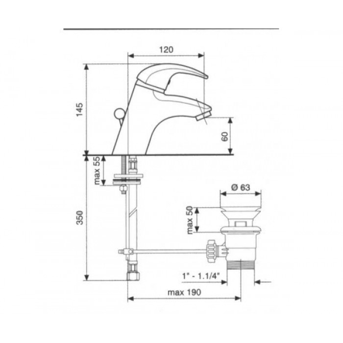 Однорычажный литой смеситель для раковины без донного клапана.