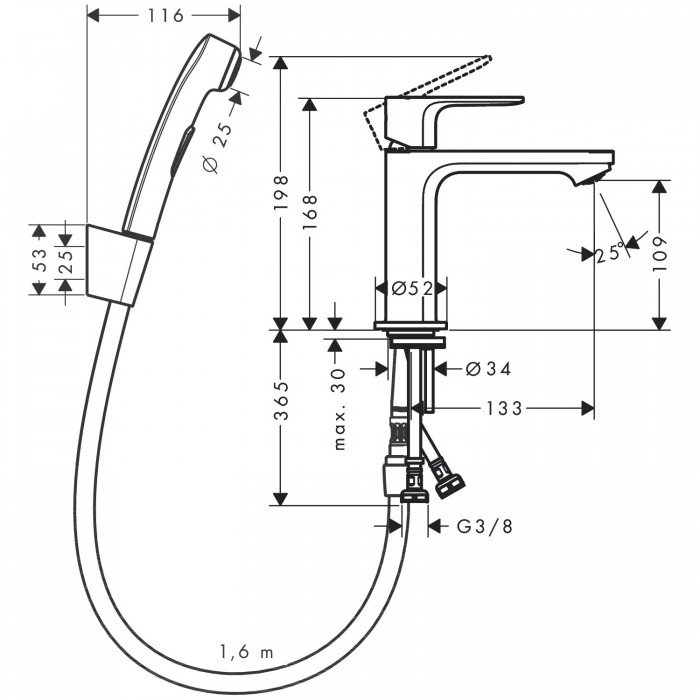 Смеситель для умывальника с гигиенической лейкой Hansgrohe REBRIS S 72215670, черный матовый