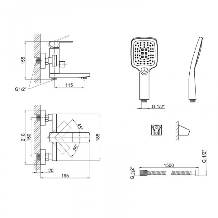 Смеситель, лейка для ручного душа, душевой шланг, кронштейн для ручного душа, крепежи.