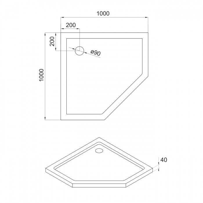 Поддон пятиугольный 1000*1000*40 мм, акрил, к душевой кабине 599-535-100. В комплекте сифон в отдельной коробке. Максимально рекомендуемая нагрузка на поддон 200 кг.