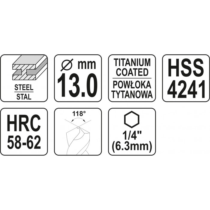 Сверло фрезерное по металлу YATO HSS-TIN 13 x 120 мм HEX - 1/4"