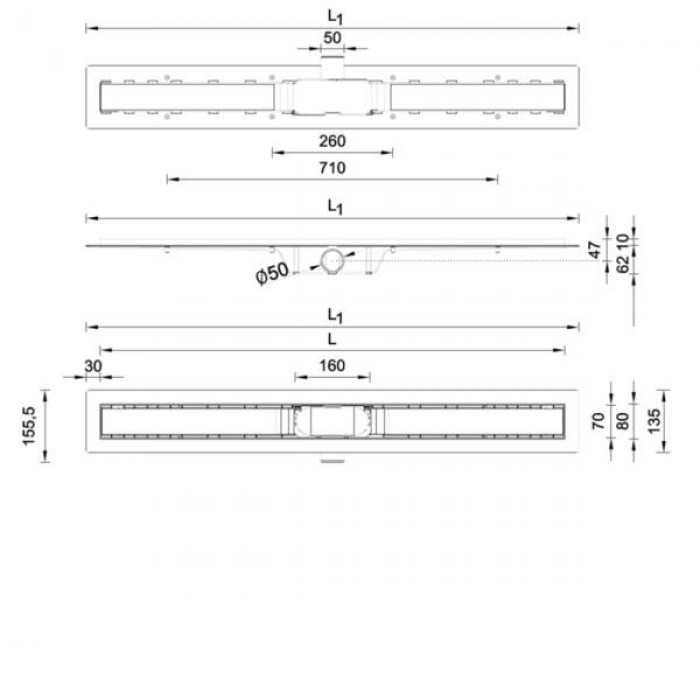 Длина решетки L - 700 мм Небольшая высота установки - 62 мм Съемный двойной гидрозатвор Высокая пропускная способность - 50-60 л/мин Выпускная труба - Ø 50 мм Регулируемая высота - 30 мм Решетка из чёрной нержавеющей ста...