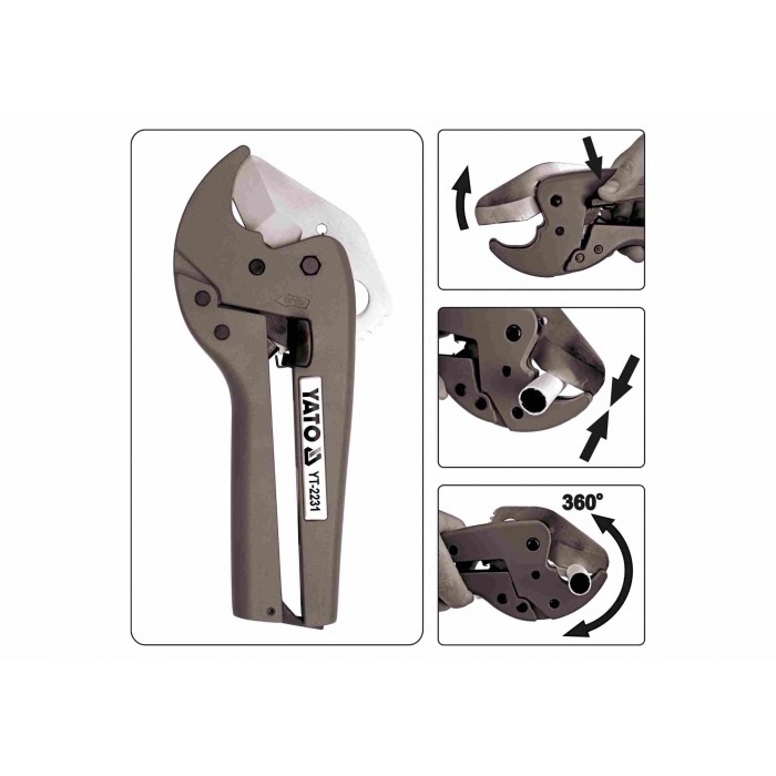 Труборез автоматический YATO YT-2231 Труборез автоматический YATO YT-2231 предназначен для резки разнообразных пластиковых труб и кабельканалов, садовых шлангов, карнизов. Инструмент имеет острозаточенное лезвие из нержа...