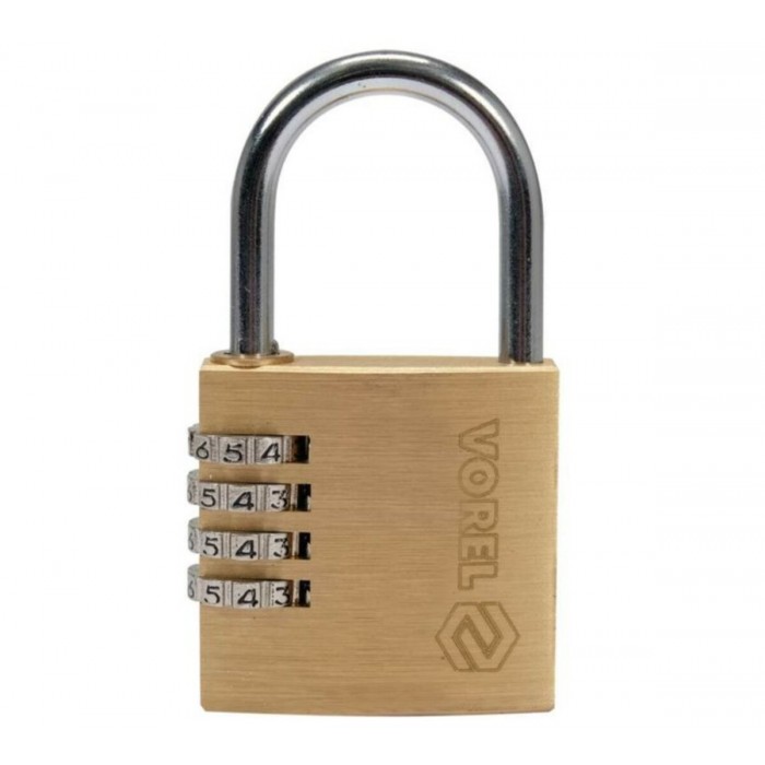 Замок навесной с кодовым замыканием VOREL латунный корпус-40х11,8х39,5 мм, стал дуга-30х25х5 мм.