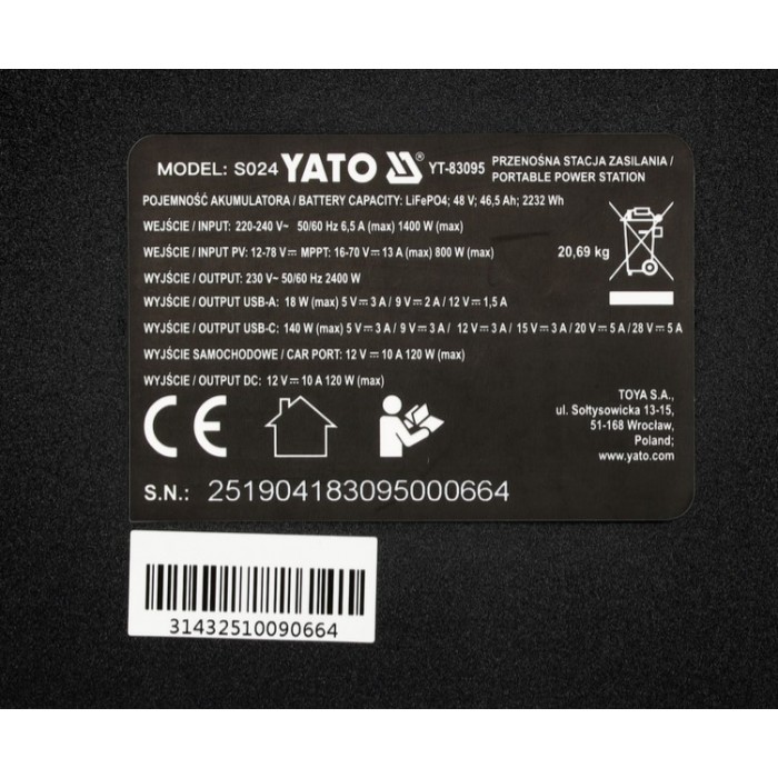 Зарядная станция YATO YT-83095 (аккумулятор LiFePO4, Чистая синусоида, 2400 Вт, пиковая мощность 4500 Вт, 46500 мА/час)