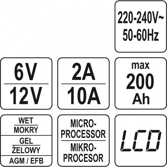 Зарядний прилад мережевий з LCD дисплеєм 230В YATO до акумуляторів 6V-2А 12V-10А, макс. 240AГод