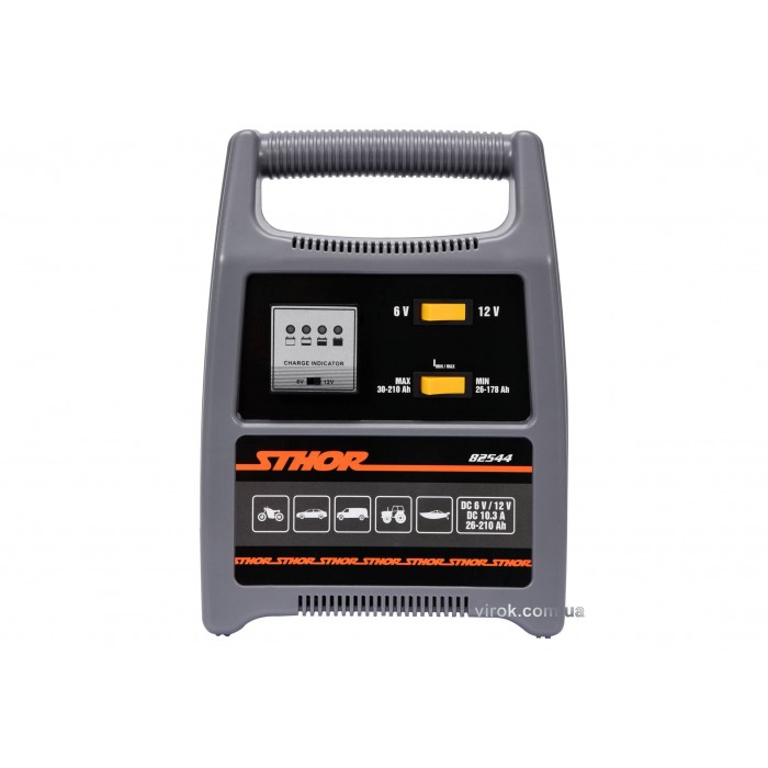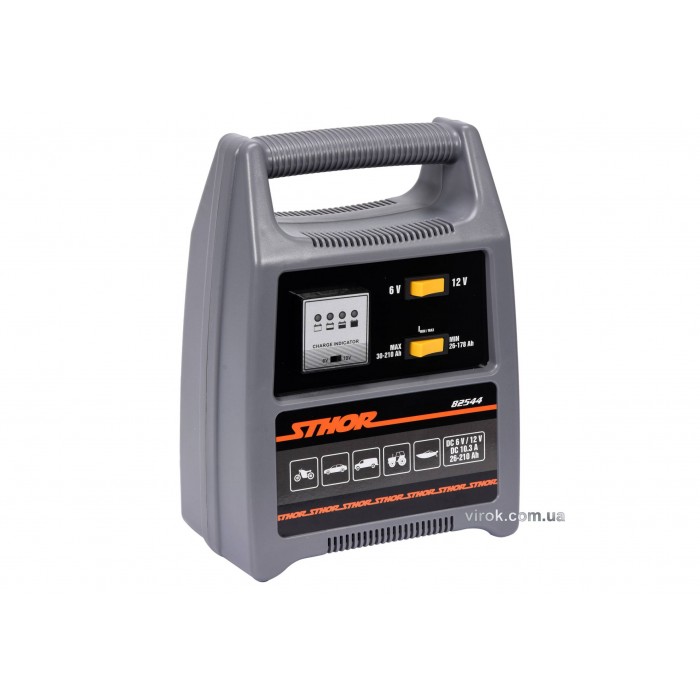 Зарядное устройство STHOR 82544 предназначено для зарядки аккумуляторов 6-12 В в мотоциклах, легковых автомобилях, пассажирских и микроавтобусах, тракторах и моторных лодках. Позволяет заряжать так званые мокрые (свинцово-кислотные) батареи емкостью до 210 Ач.